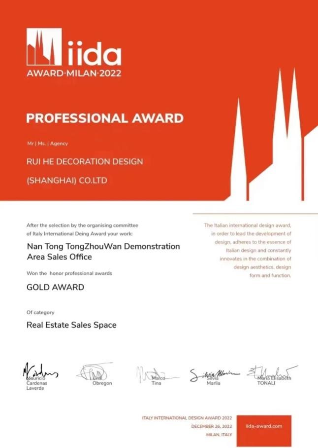 近日,盛和房產開發的盛和?灣上文華項目(通州灣TR20011地塊)示范區售樓處設計方案從全球包括意大利、法國、西班牙、日本、韓國、中國及港澳臺等幾十個國家地區的設計師和設計機構近千套設計作品中脫穎而出,斬獲2022意大利IIDA AWARD國際設計大獎地產售樓類金獎。